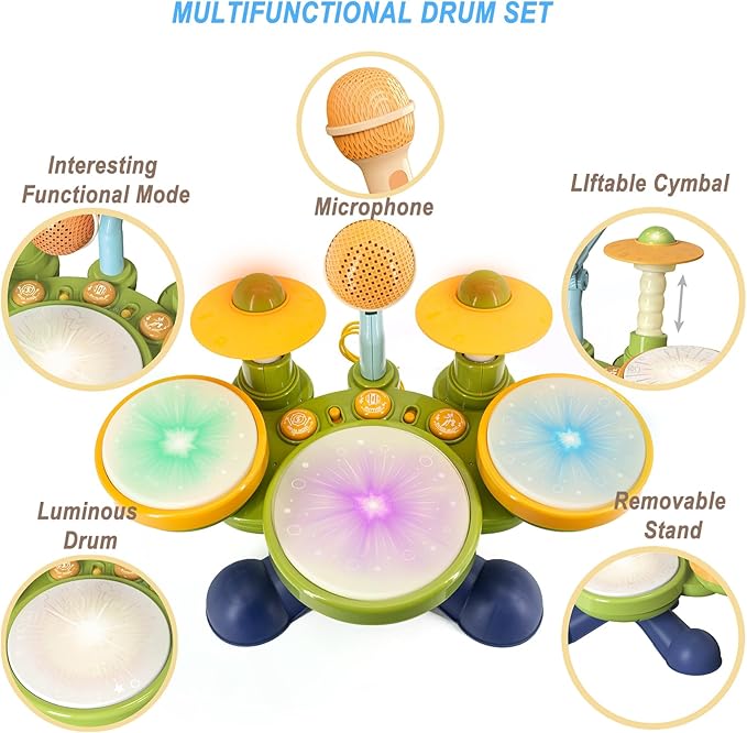 - PERFECT INSTRUMENT LEARNING TOY : The acoustics of drum set microphone are excellent. Your kids can sing and play drum set at the same time, which will fully develop the children's coordination skills