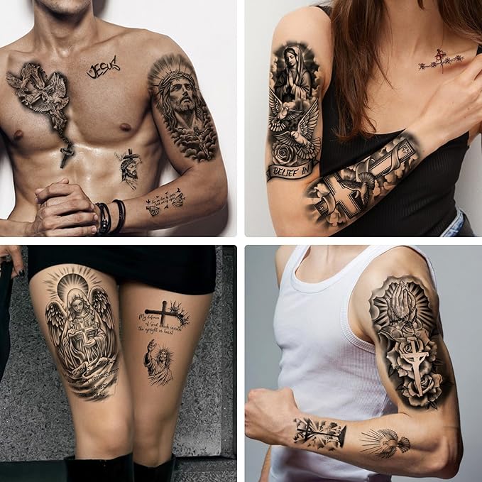 77 Sheets Christian Temporary Tattoo for Women Men, 17 Sheets Half Arm Religious Cross Jesus God Angels Fake Tattoos for Adult Arm Chest, 60 Sheets Christ Tiny Realistic Tattoos Stickers for Kids