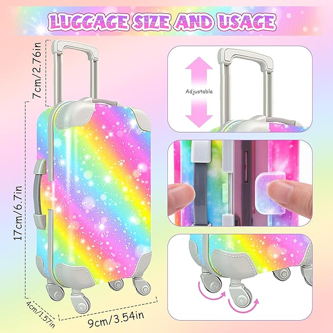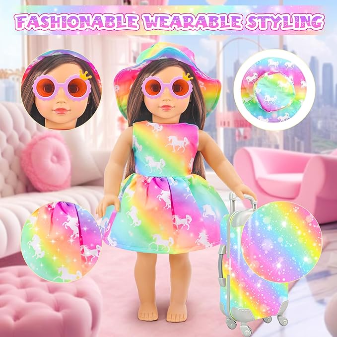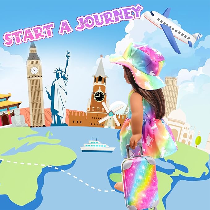 - COMPLETE TRAVEL ACCESSORIES: We offer a full doll travel play set including a set of 18 inch doll dress and hat, 1 brilliant colors suitcase, 2 airline tickets, 1 camera, 1 unicorn travel pillow, 1 sunglasses, 1 credit card, 1 passport, cashes, and 1 laptop, 1 doll makeup 3 piece set, 1 folding mirror comb. Fits 18 inch doll but DOLL IS NOT INCLUDED in the kit!