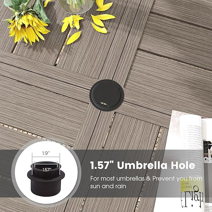 - 【Adjustable Umbrella Hole】Equipped with a 1.57" - 1.9" umbrella hole, you can resize it by switching the lid to fit your umbrella. The bottom of the table also provides a fixing ring for further fix your umbrella and ensure its stability