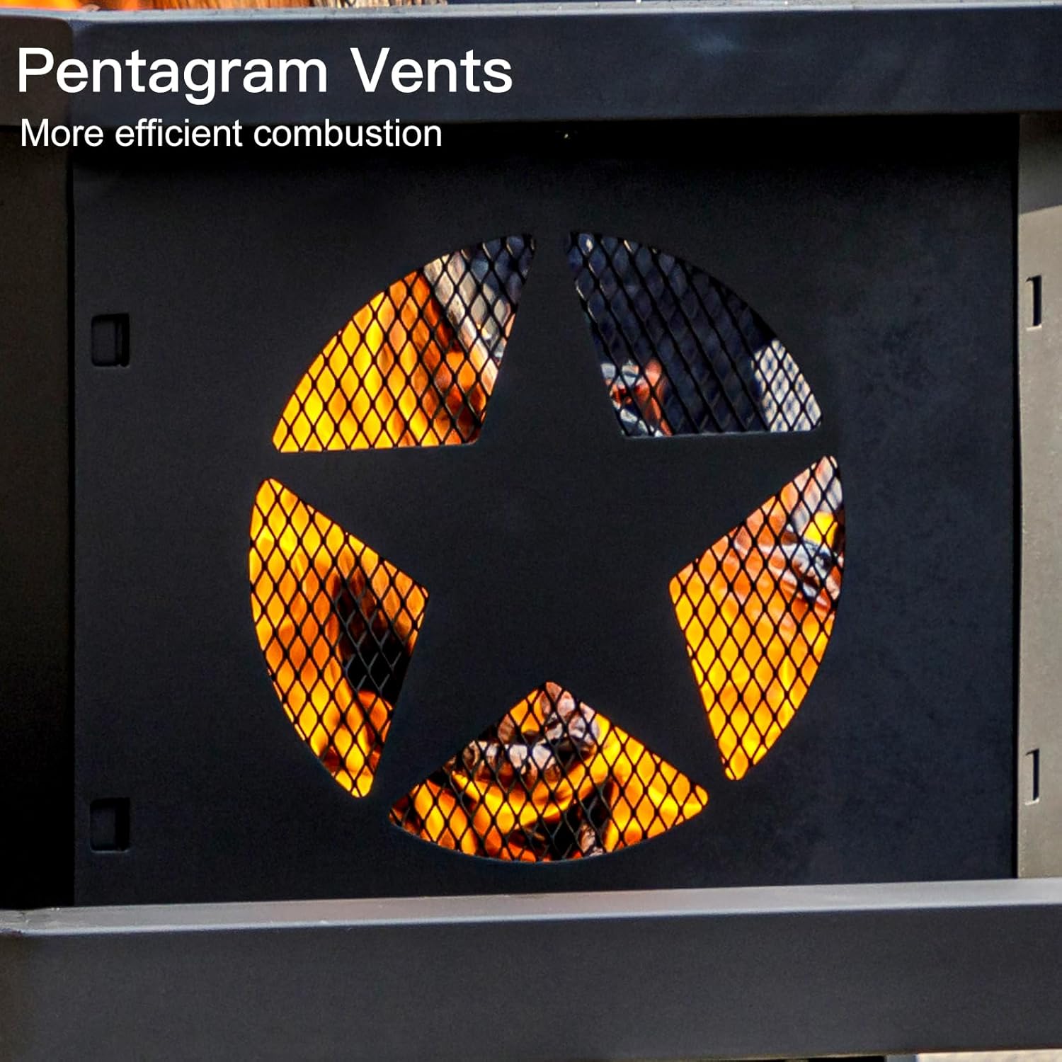 - [Beautiful & Safe Design] Panovue fire pit is unique octagon which is complement to any style yard. Wood fire pit for outside are coated with high-temperature powder for durability and rust resistance. Firepit has 4 sturdy legs and enough weight can improve stability on uneven ground. The mesh screen has beautiful star pattern which catches firelight for creating fun shadows, also it can avoid sparks and embers from flying out. Fire poker lets you to move wood safely.