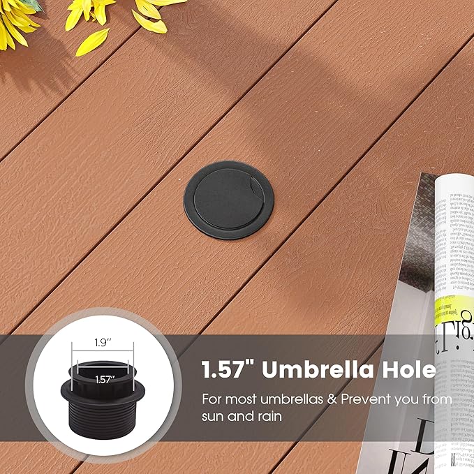 - 【Adjustable Umbrella Hole】Equipped with a 1.57" - 1.9" umbrella hole, you can resize it by switching the lid to fit your umbrella. The bottom of the table also provides a fixing ring for further fix your umbrella and ensure its stability