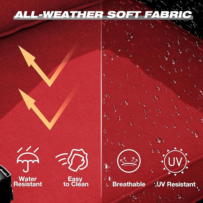 - Comfy Thick Cushion: Upgraded cushions are all made of high density sponge with 4 inches, thick sponge seat cushions and soft back cushions gives you comfortable support. The cushion cover is made from olefin fabric, which is breathable, UV-resistant, and waterproof. It features a zipper on the side for easy removal and cleaning
