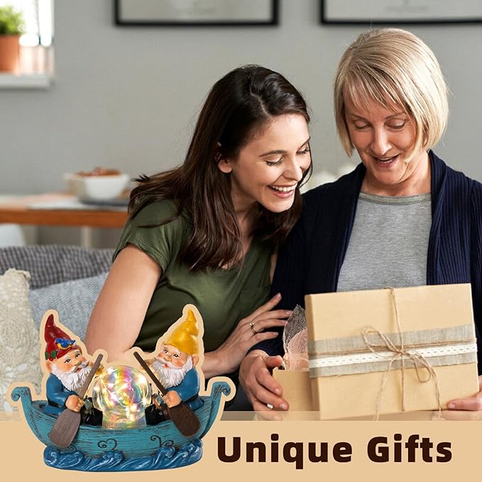 - Gnome Boating Statue:Two gnomes happily sit in a small boat,holding oars,with a glowing globe light in the centre,with expressions that are both amusing and heartwarming.With its vibrant colours and delicate details,the garden gnome statue displays a lively and inviting atmosphere,adding a touch of joy to any garden or outdoor space.
