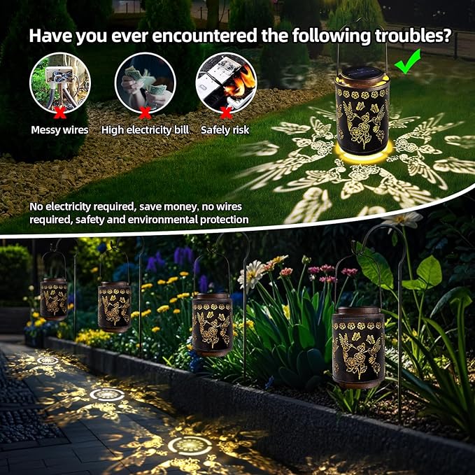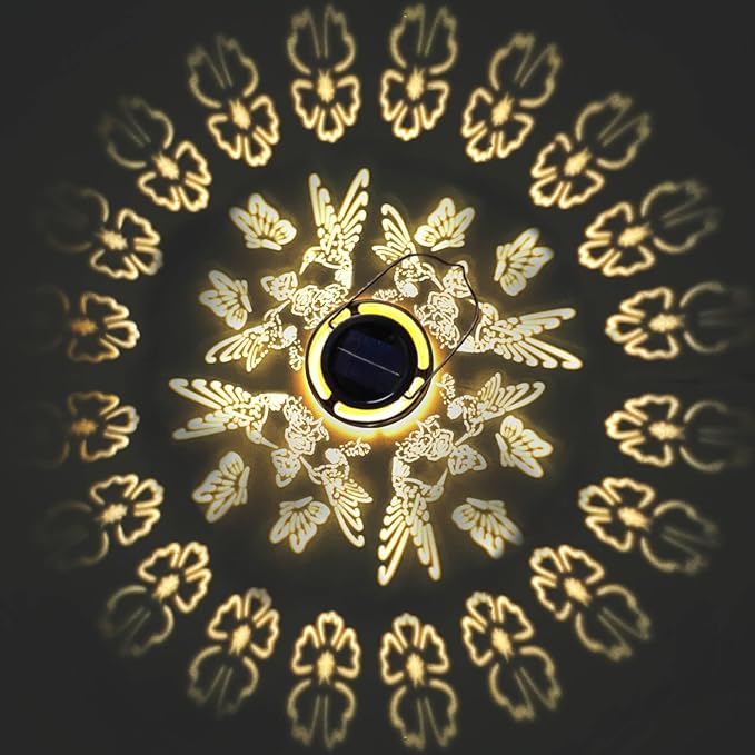 - Charming Hummingbird Design: This solar garden light features an exquisite vintage copper finish with a delicate hummingbird and floral hollow design. When lit at night, it casts crystal-clear, vibrant projections, creating a mesmerizing ambiance for your garden. The warm glow enhances your outdoor décor, adding a magical touch and transforming your patio, yard, porch, or garden pathway into beautiful yard art