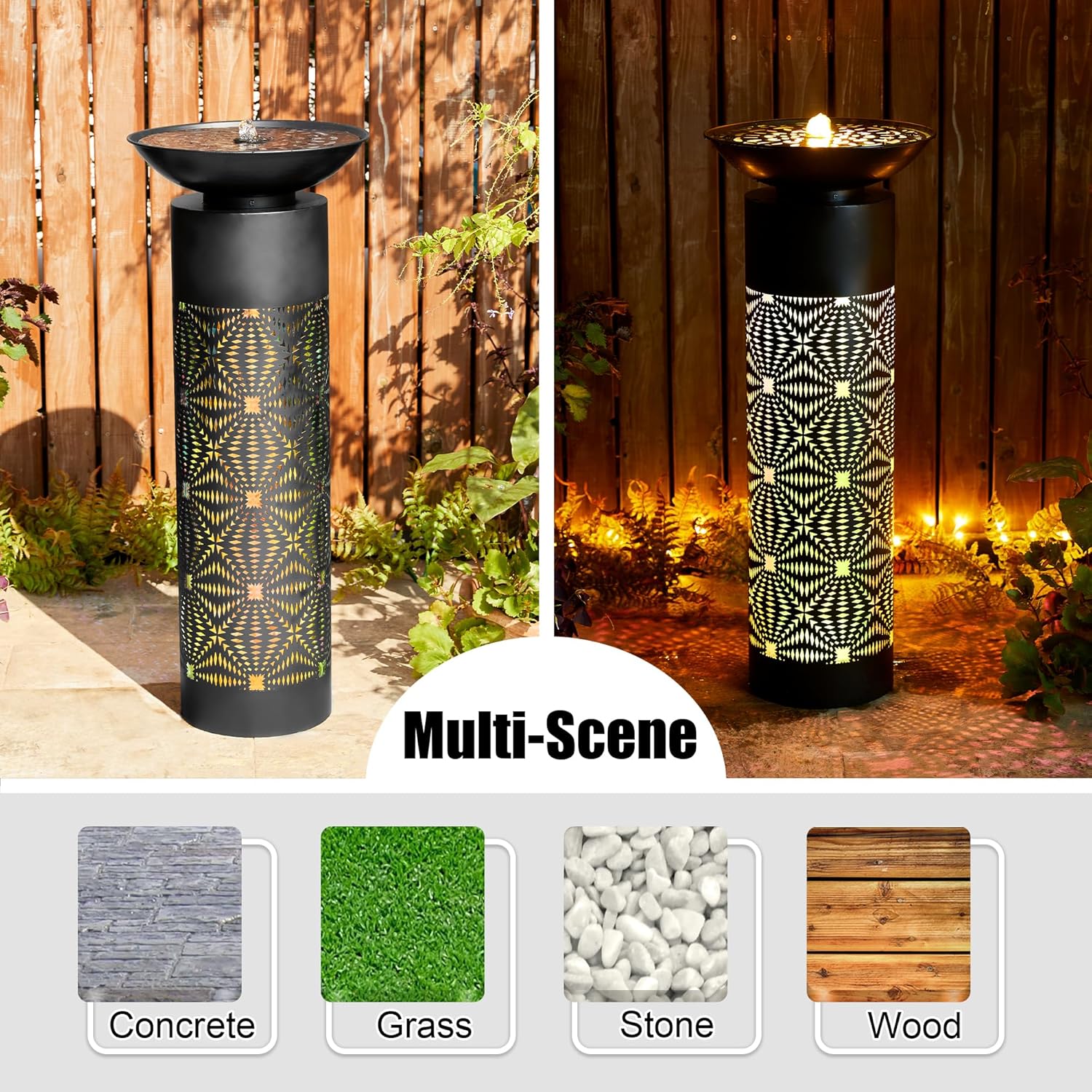 - Eye-Catching LED Outdoor Fountain :This weather-resistant metal bird bath fountain combines intricate cutout patterns with built-in warm white LED lighting to create mesmerizing light-and-shadow displays that elevate any outdoor space. The gently trickling water sparkles under the bright yet cozy glow, blending modern design with natural tranquility for a captivating focal point in gardens, patios, or decks.