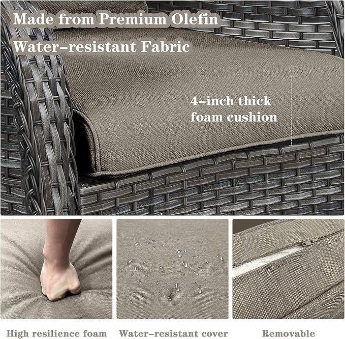- 3. Durable All-Weather Wicker & Sturdy Steel Frame: This outdoor furniture set is built to withstand the elements with its powder-coated steel frame and all-weather hand-woven PE wicker. rustproof, making it perfect for year-round outdoor enjoyment. The brown wicker design adds a sophisticated touch to any patio space.