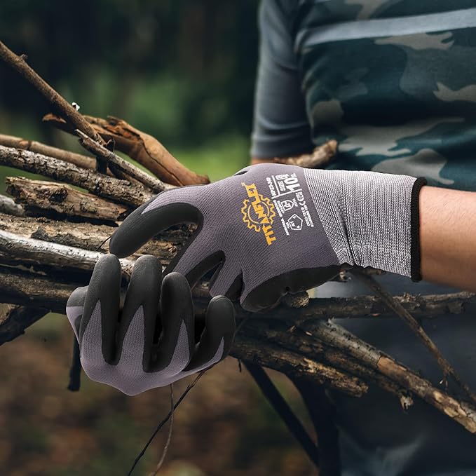 • TOUCHSCREEN & PRECISION CONTROL: No need to take the gloves off! Seamless touchscreen compatibility (phones/tablets) + enhanced fingertip sensitivity handles screws, bolts, and electronics effortlessly. Microfoam nitrile coated work gloves with unisex industrial design fits all hand sizes – no need for bulky women's gloves.