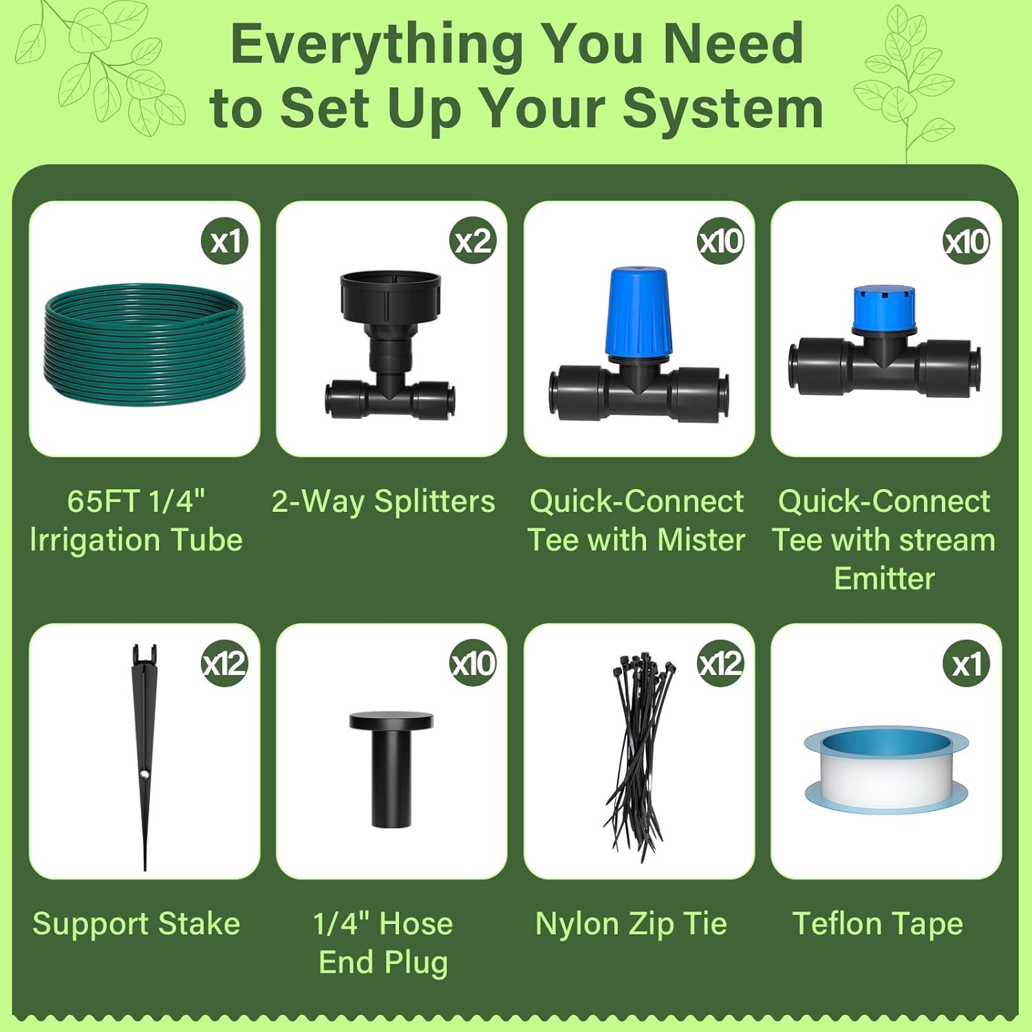- 🔧 All-in-one drip irrigation kit – Includes 65FT tubing, 10 stream drippers, 10 misting nozzles, quick-connect fittings, and everything you need for a fully functional garden drip irrigation system. Ideal for anyone looking to build or upgrade their irrigation system.