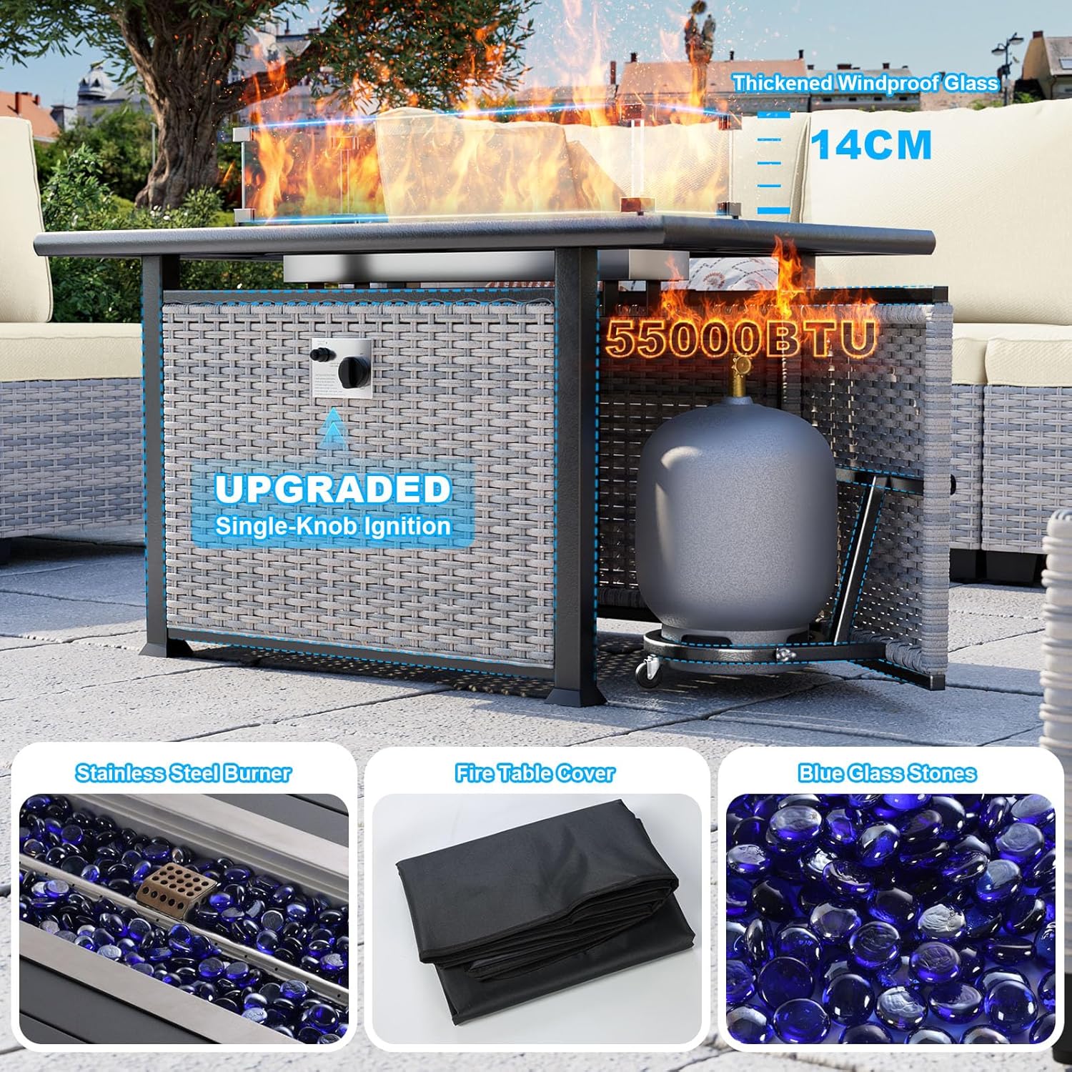 8-Piece Patio Furniture Set, Outdoor Patio Furniture with 55,000 BTU Fire Pit Table, Thick Cushions, Modular Patio Sofa, Dual-Strand Wicker Rattan, Rust-Resistant Frame, Ivory