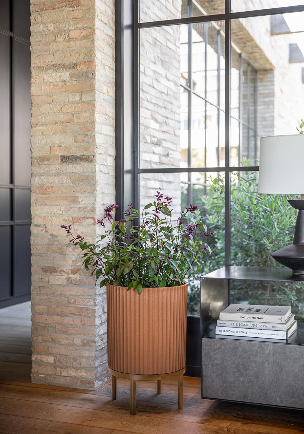 Veradek Demi Series Round Planter w/Stand for Porch/Patio | Durable Plastic-Stone Composite & Wooden Stand | Modern Décor for Tall Plants, Flowers
