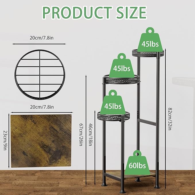 - Elegance of Iron and Wood Fusion:Our corner plant stand for indoor plants features a sturdy metal frame with three metal plates and a large wooden plate (measuring about 7.8 x9 inches). The modern combination of iron and wood creates an attractive and stylish addition to your home