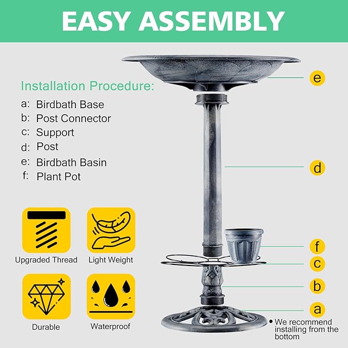 - STURDY BASE and FILLABLE DESIGN: Equipped with 3 ground stakes to keep it in place. Fill the voids in the base posts with sand or water to add weight to the bird bath bowl and keep it upright for your feathered guests