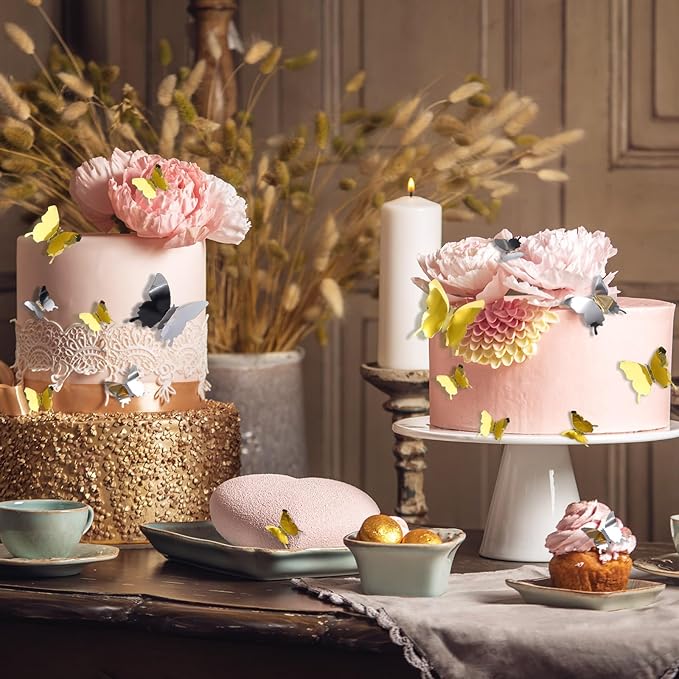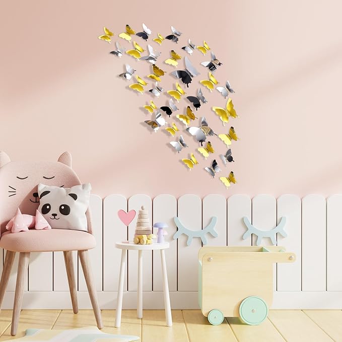 BBTO 48 Pieces Butterfly Wall Decor DIY Mirror 3D Butterfly Stickers Removable Decals for Home Bedroom School Bathroom Living Room Decor(Gold,Silver)