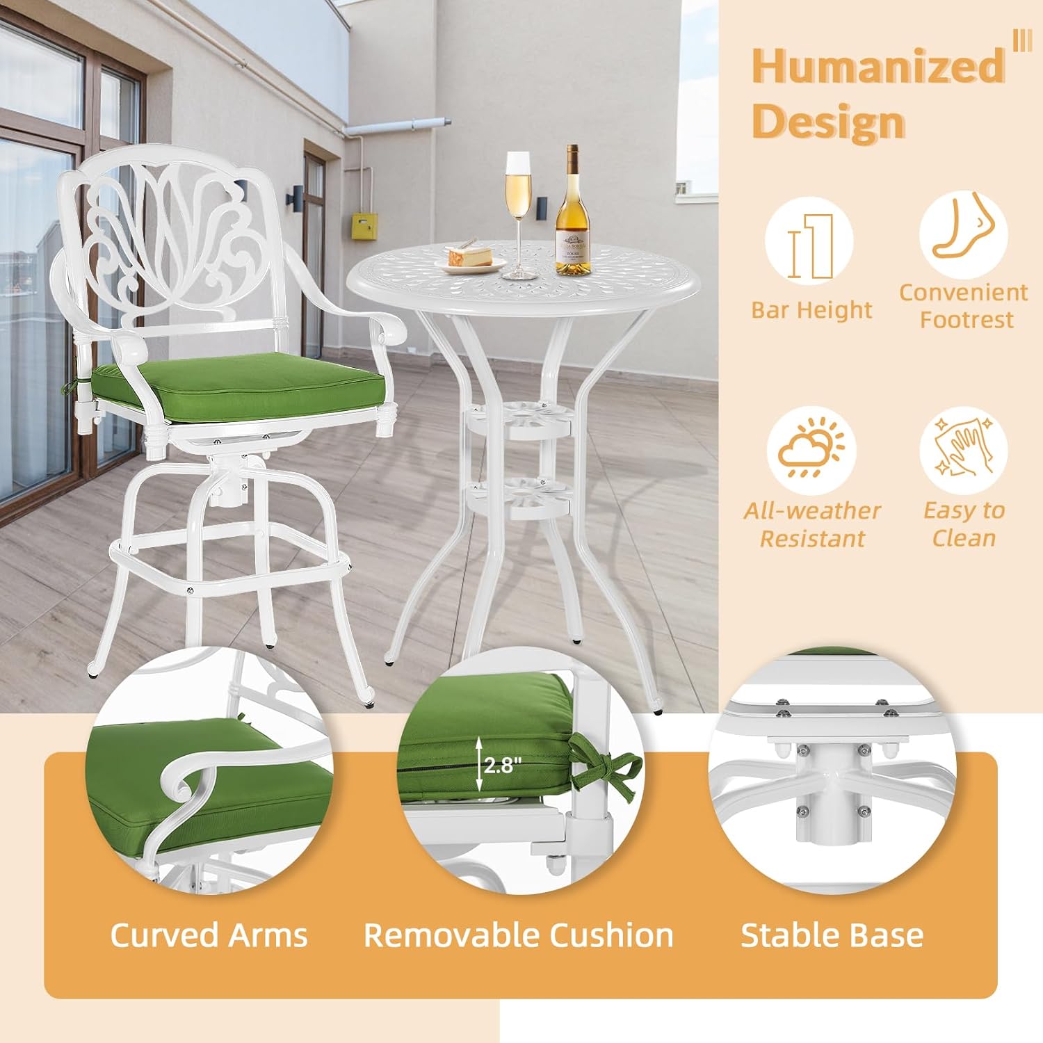 3 Pieces Patio Swivel Bar Set, Patio High Top Bar Table and Chairs Set, All-Weather Cast Aluminum High Swivel Bar Stools Chair Set of 2 and 31" Table, Patio Bistro Set for Garden,White