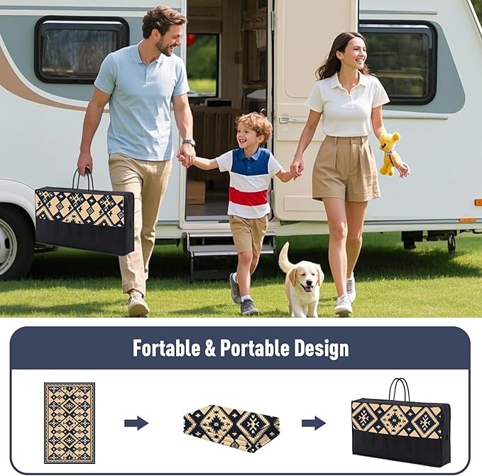 - Portable & Durable: This outdoor plastic rug with seams can be rolled or folded into a compact size and comes with a carrying bag for easy portability. Perfect for outdoor activities, picnics, sunbathing, and RV road trips. The heat-sealed edges prevent wear and tear, withstanding any environment, traffic, or scratches