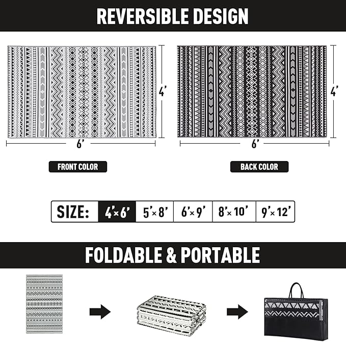 - Reversible Design: This double-sided patio rug features beautiful patterns on both sides, allowing you to quickly flip it over and instantly refresh your patio, porch, backyard, deck, RV campsite, or any outdoor space. A simple way to transform your style effortlessly