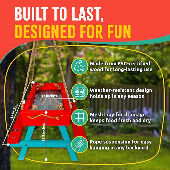 - Customizable Birdseed Options – Fill your Picnic Table Bird Feeder with black oil sunflower seeds, nyjer seeds, or suet pellets to attract a wide range of birds including cardinals, chickadees, and finches.