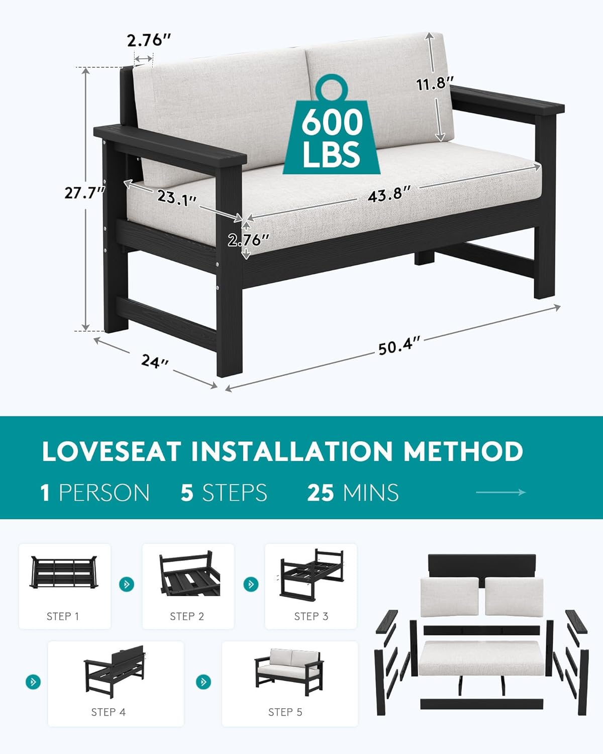 SERWALL Black HDPE Outdoor Loveseat with Khaki Cushions, All Weather Use Outdoor Loveseat Sofa, Black Frame with Khaki Cushions