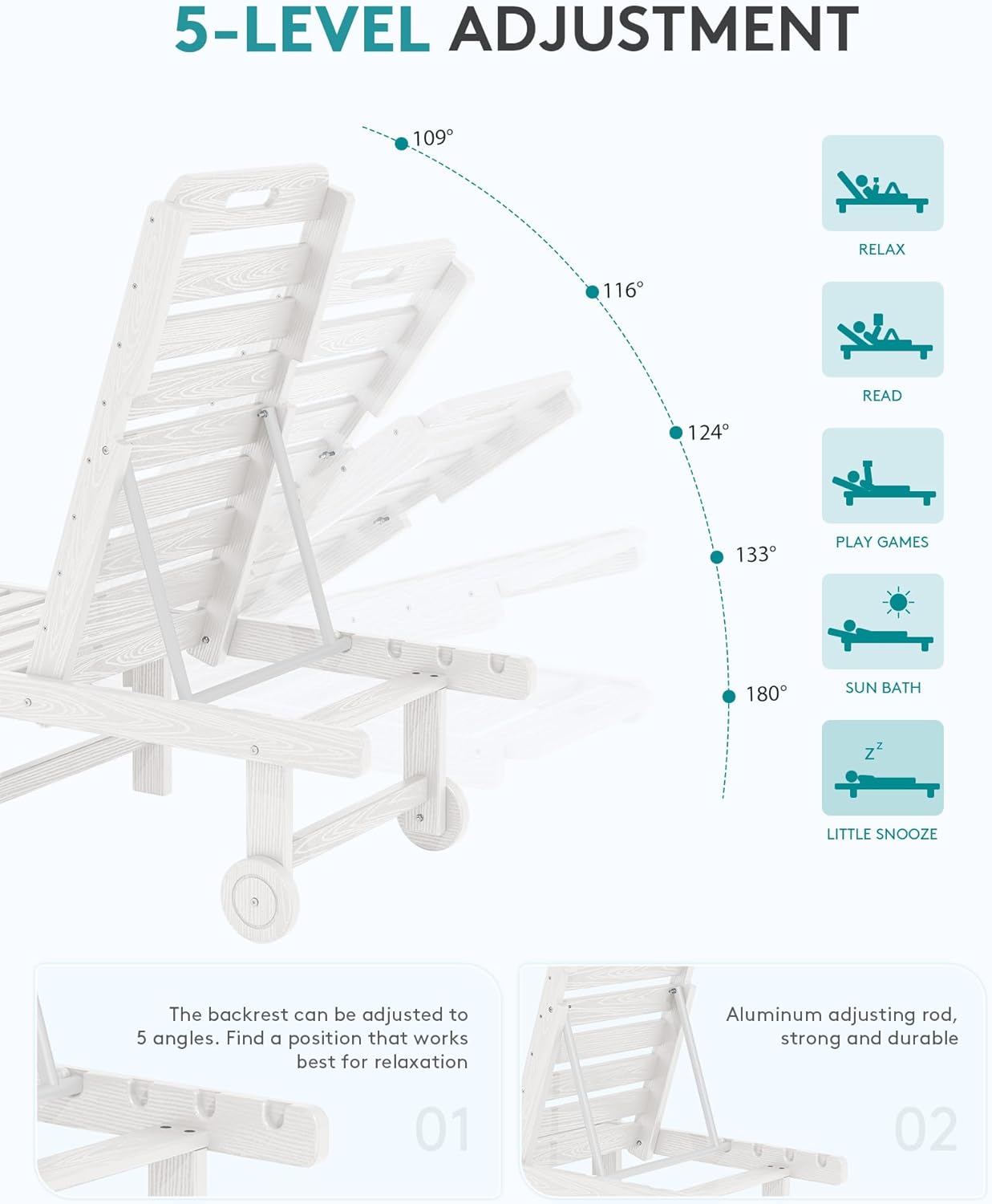 - All Weather Use: Built for all seasons with premium, fade-resistant HDPE lumber. Designed to withstand rain, sun, and wind, this outdoor chaise lounge chair feature 304 stainless steel screws, enjoy years of beauty, season after season