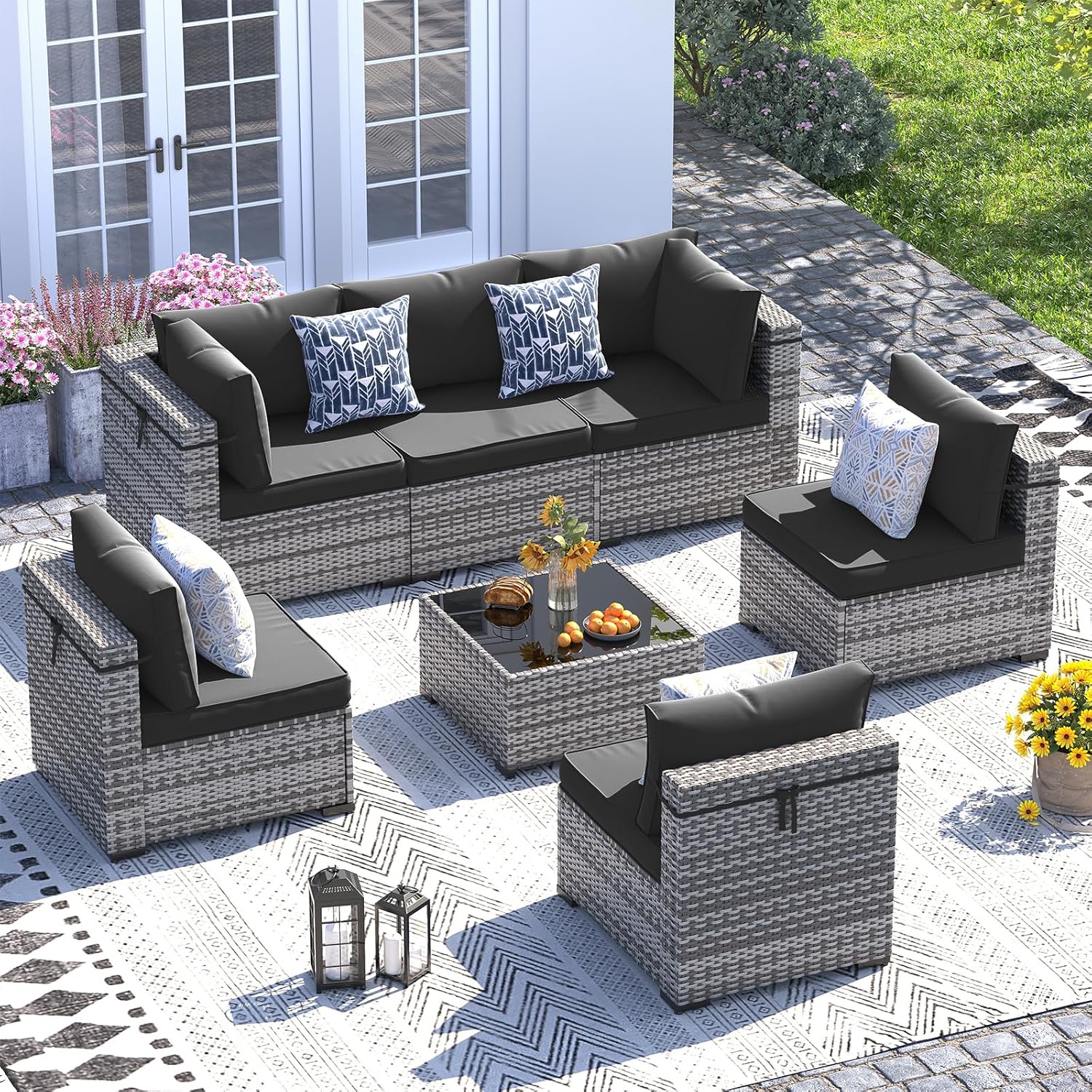 UDPATIO Patio Furniture Set, 7 Piece Outdoor Sectional Sofa,Modular Wicker Outdoor Furniture Conversation Sets with Waterproof Cover for Backyard Deck(Grey/Black)