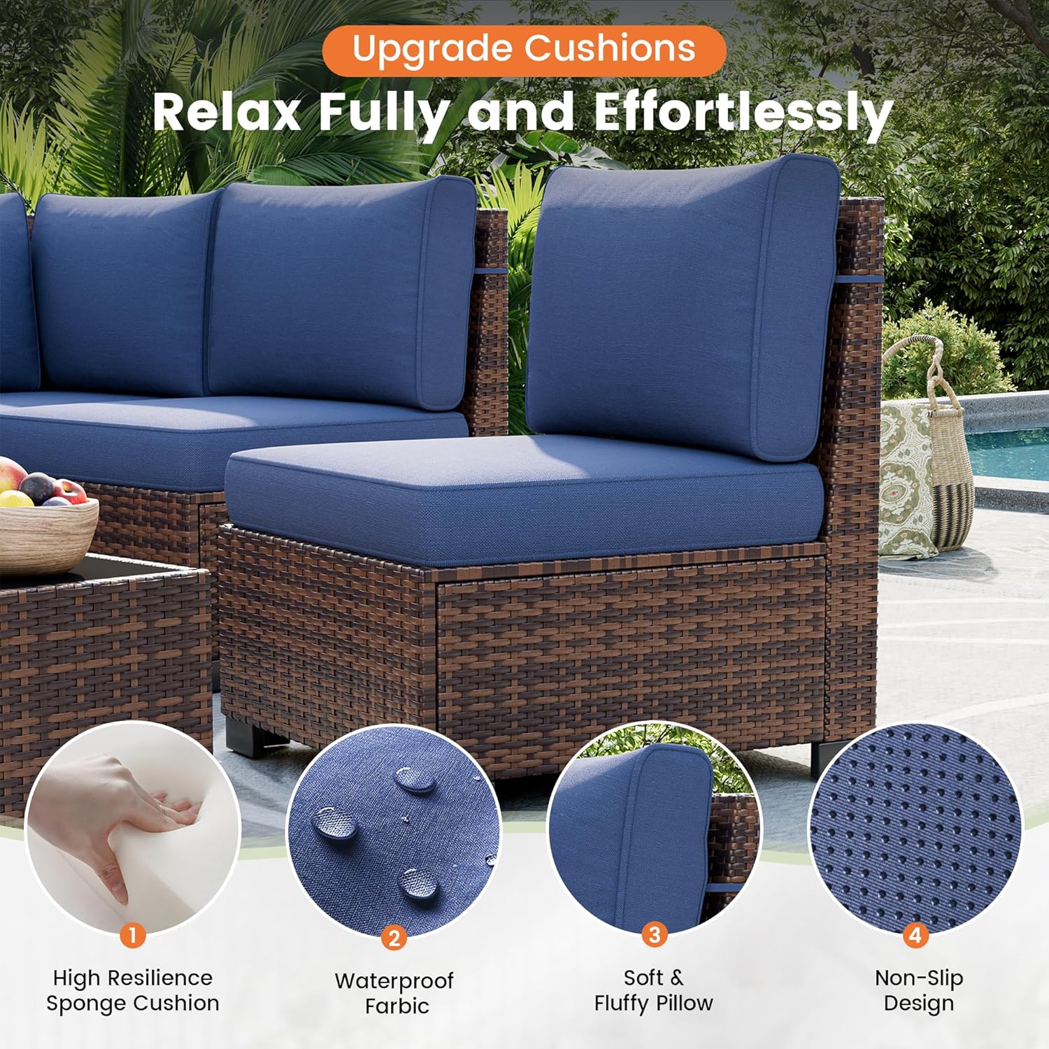 UDPATIO Patio Furniture Set with Fire Pit Table, 8 Inch Armrest Outdoor Sectional Sofa, 7 Piece Wicker Outdoor Furniture Conversation Sets with Waterproof Cover for Backyard Deck(Brown/Navy Blue)
