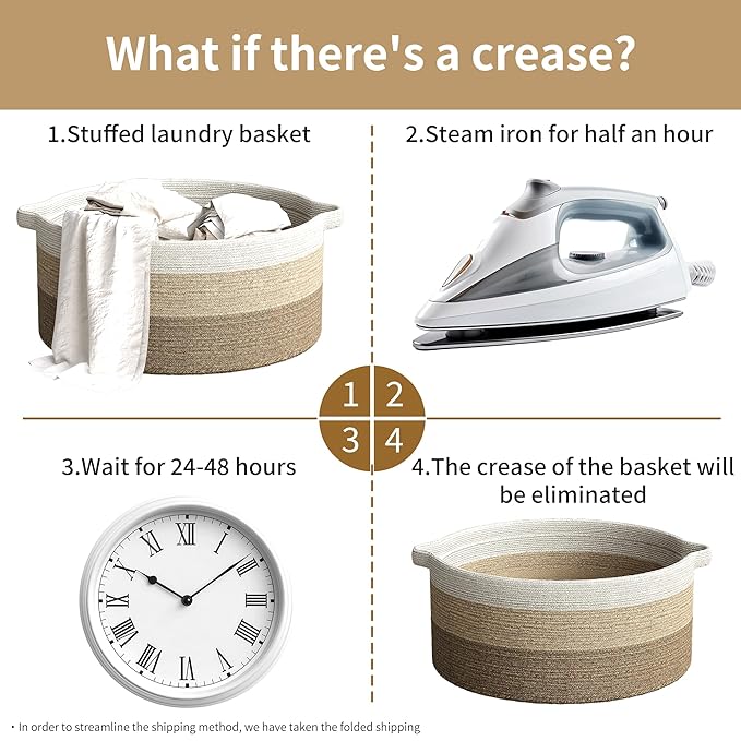 - Note: Blankets basket comes folded and may have creases. Fully fill the rope basket with towels or clothes and wait for 1-2 days will help reshape the blanket basket. Alternatively, use steam or ironing for a quick reshape the laundry basket