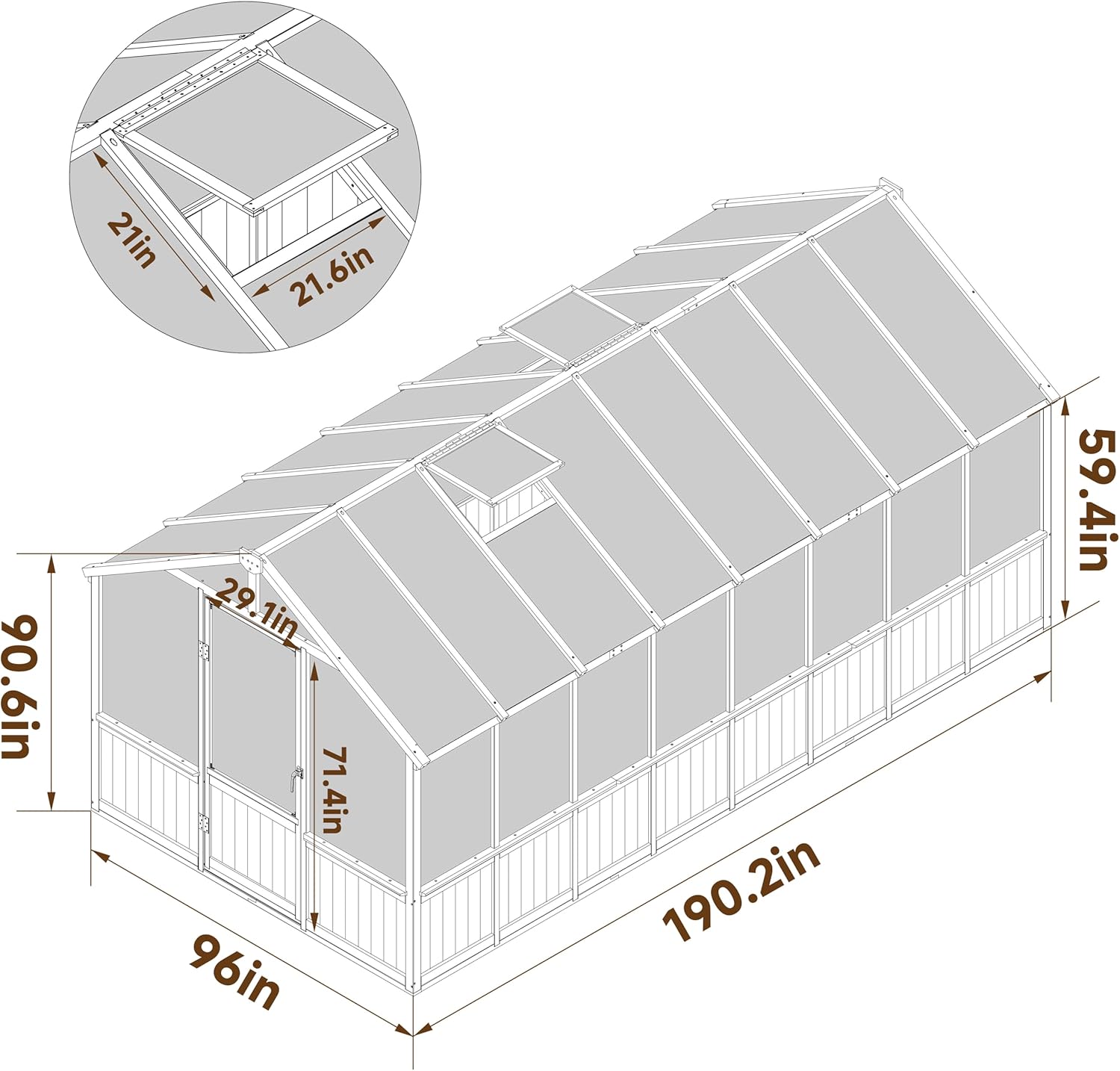 - Dimensions - Overall size:96"W x 190.2"D x 90.6"H. Door size: 29.1"W x 71.4"H. Vent size: 21"W x 21.6"D. The greenhouse is shipped in 5 boxes. Before purchasing, please make sure that the installation is allowed in your area