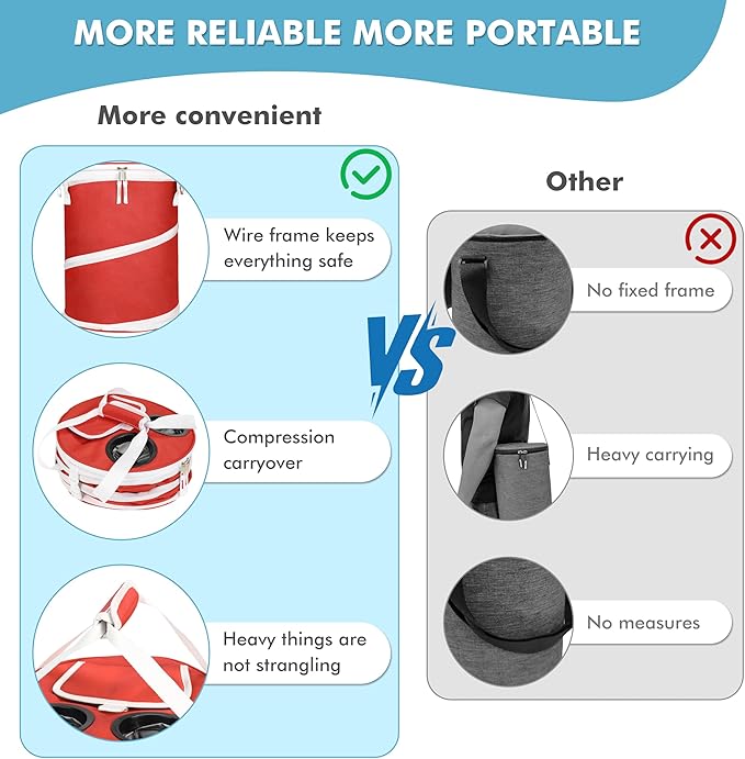 - Cup Holder: The collapsible cooler comes with two unique cup holder designs, Whether using a round cooler for a backyard party, a trip, fishing, or an adventure, these cup holders ensure a safe place for your open drink. They are designed to fit cans of all sizes and prevent leaks. Whether it's a picnic or a poolside break, you can rely on these cup holders to keep your drinks within reach while enjoying your time. Foldable cooler bags can be easily folded up, saving space like a flat cooler.