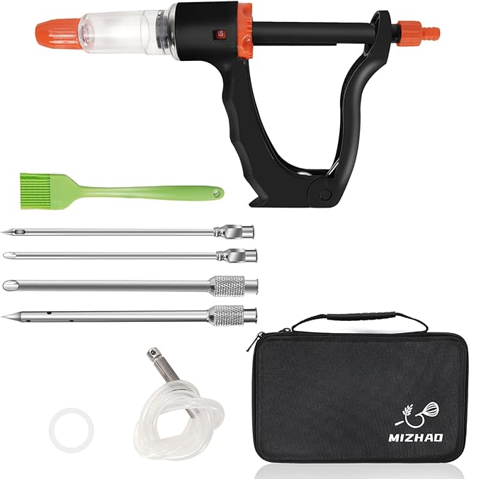 - 4 Stainless Steel Needles for All Meat Types – Includes angled, six-hole, and precision needles designed for thick brisket, tender steaks, poultry, and seafood. Perfect for BBQ enthusiasts, chefs, and home cooks.