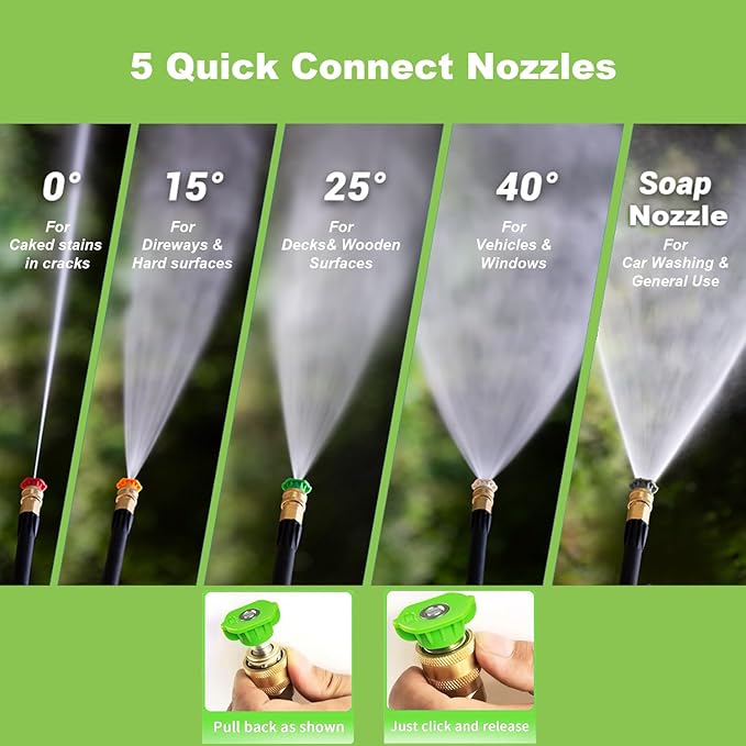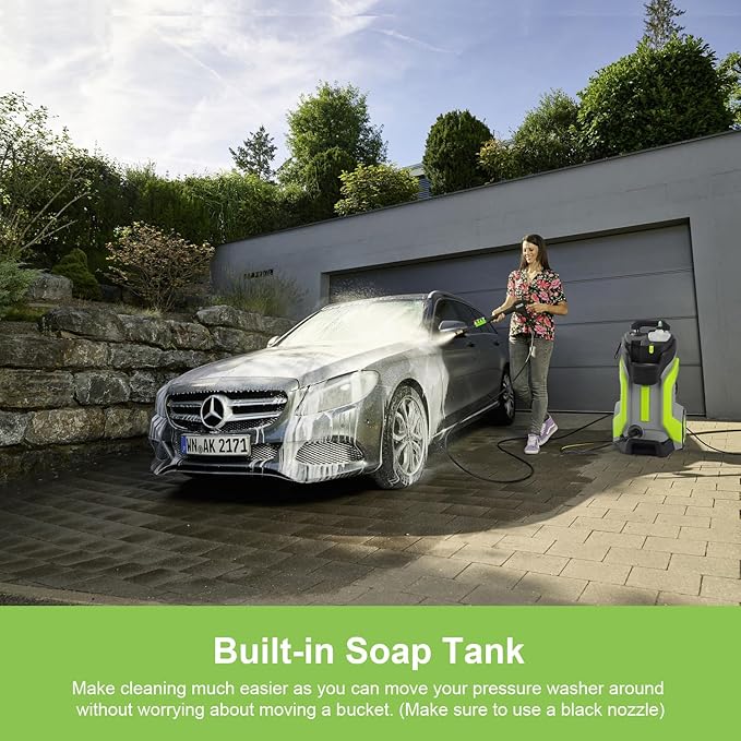 - UPGRADED ACCESSORIES: The Commowner portable pressure washer 2.0 comes with top-of-the-line accessories for a thorough cleaning experience; Navigate with ease using the 33-foot real rubber hose, choose from 5 QC nozzles (0°, 15°, 25°, 40°, soap) for different cleaning needs, and enjoy additional features like the 500ml detergent tank, metal lance, spray gun, cleaning pin, welcome guide and 20-foot electric cord