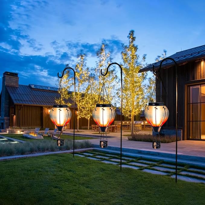 - 【Hanging Solar Light with Flickering Flame】The glass hot air balloon solar lantern with metal "S" hooks can be easily hung anywhere, such as balconies, porches, ledges or trees. The bright hot air balloon decorations during the day can add color to your outdoor space, and at night to add a warm and romantic atmosphere to your homeland.