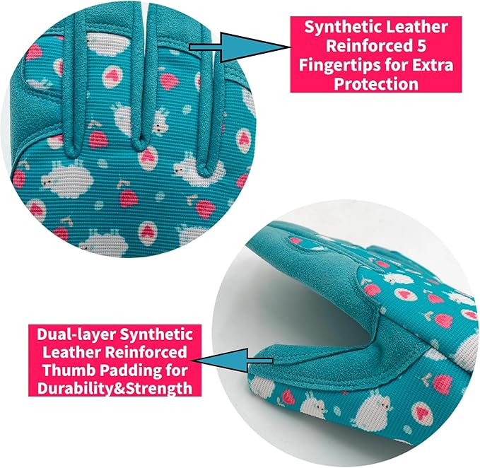 • ❷ Garden Gloves for Gardening-Stretchable double-layer spandex design back keep your hands flexible,breathable&comfortable on the job.Synthetic leather with foam padded palm provides excellent abrasion,puncture and tear resistance and reinforced fingertips for added durability.Elastic cuff for snug secure fit.