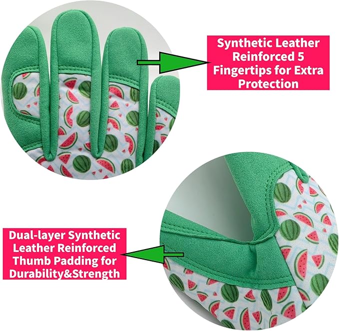 - ❷ Garden Gloves for Gardening-Stretchable double-layer spandex design back keep your hands flexible,breathable&comfortable on the job.Synthetic leather with foam padded palm provides excellent abrasion,puncture and tear resistance and reinforced fingertips for added durability.Elastic cuff for snug secure fit.