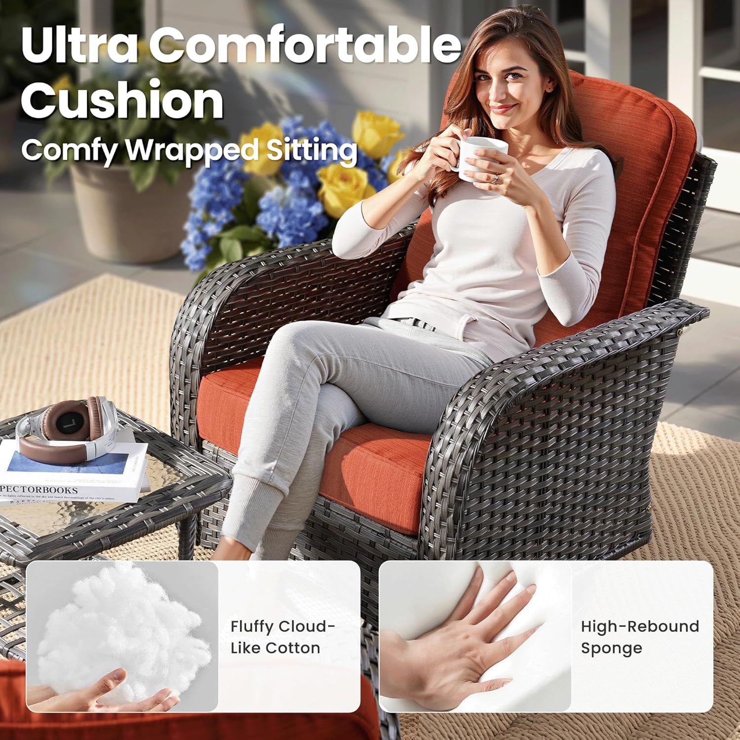 - Rocking Swivel Chairs: The fully rotating patio chairs allows you to 360 degrees swivel and 30 degrees rocking smoothly and silently. The unique forward and backward swing design allows you to easily enjoy a comprehensive comfortable experience, whether it's gathering, reading, or relaxing, you can find the most comfortable angle