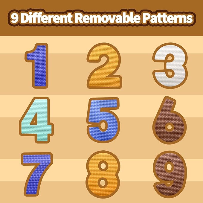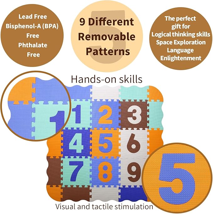 - Safety & Easy Setup --- 47.4"x47.4" (10.8 sq ft) soft EVA foam mat with interlocking tiles. 0.4" thick cushion prevents falls. Assemble in 5 mins – 9 base + 12 edge + 4 corner pieces. Meets ASTM F963-17 safety standards with phthalate-free materials