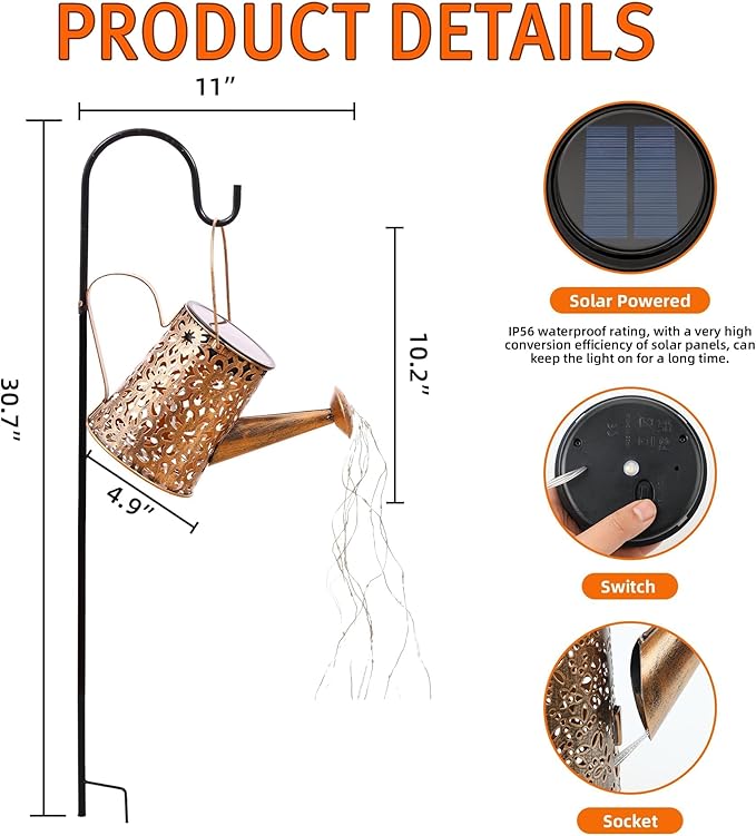 - 【Multiple Using Modes】Offering versatile usage, you can place this patio decor watering can on the ground or hang it using the included shepherd's hook. Choose between Steady and Streaming lighting modes for different atmospheres.