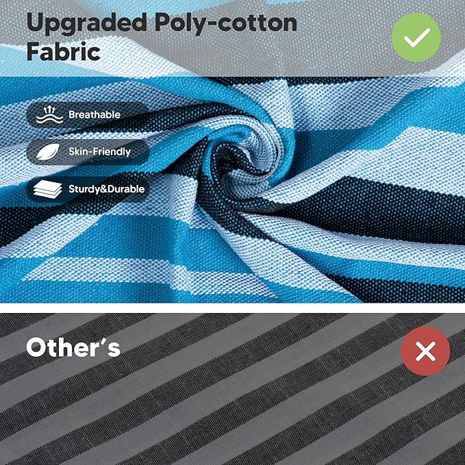 - Upgraded Fabric: Our Brazilian Camping hammock is made of eco-friendly thicker version poly-cotton fabric (no lint, no odor, not pilling, not fading, skin-friendly, and breathable), stronger and much more durable than ordinary fabric hammocks. A comfortable cocoon style hammock can keep you safe while enjoying the peaceful leisure time