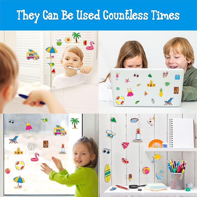 40PCS Reusable Jelly Stickers, Waterproof Summer Beach Window Cling Stickers for Toddlers, Removable Easy to Clean Gel Decals for Kids, Adults, Home & Classroom Decors, Travel Toy (Not Edible)