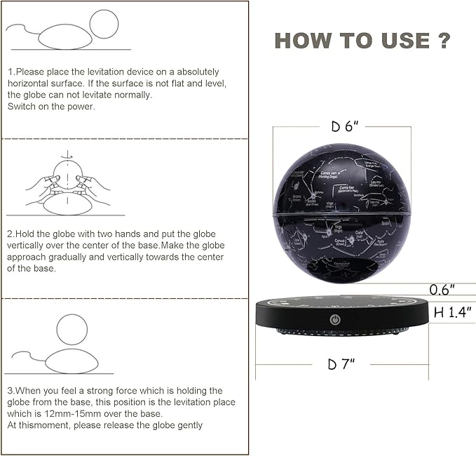 - 【KEEP WORKING】The globe is made to operate 24x7 no need to shut it off! As long as the base is powered the globe levitates perpetually. The globe is attracted to the polarity in the base and once the base is powered off will cling to the base naturally