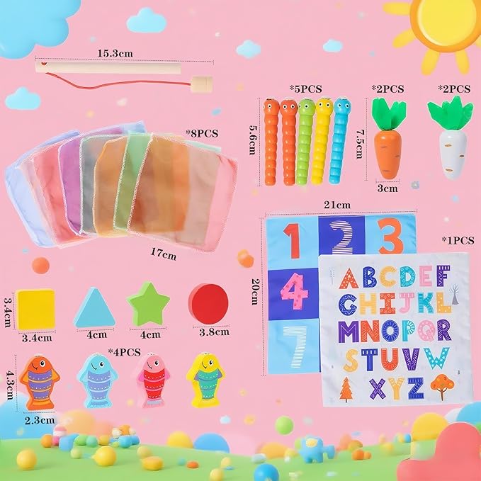 - Shape & Color Sorting Montessori Toys-- the set contains includes 5 cute little worm toys , 4 carrot shaped toy blocks , 4 lifelike small fish magnetic toys , 1 fishing magnetic rod , 4 geometric shape matching blocks. This activity cube is made from solid wood and adorned with water-based paint . With BPA Free and lead-free materials , the surface and corners are meticulously rounded and polished , ensuring safety for your baby. Compliant with US toy standards, including CPC & CPSIA.