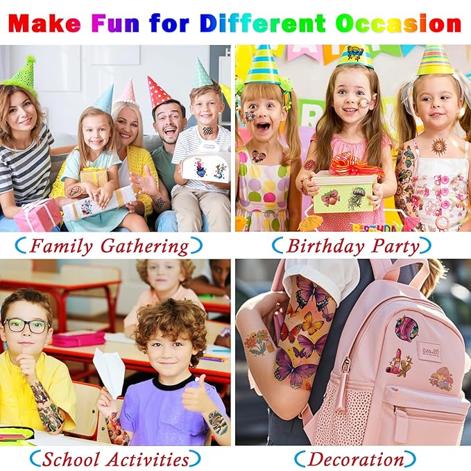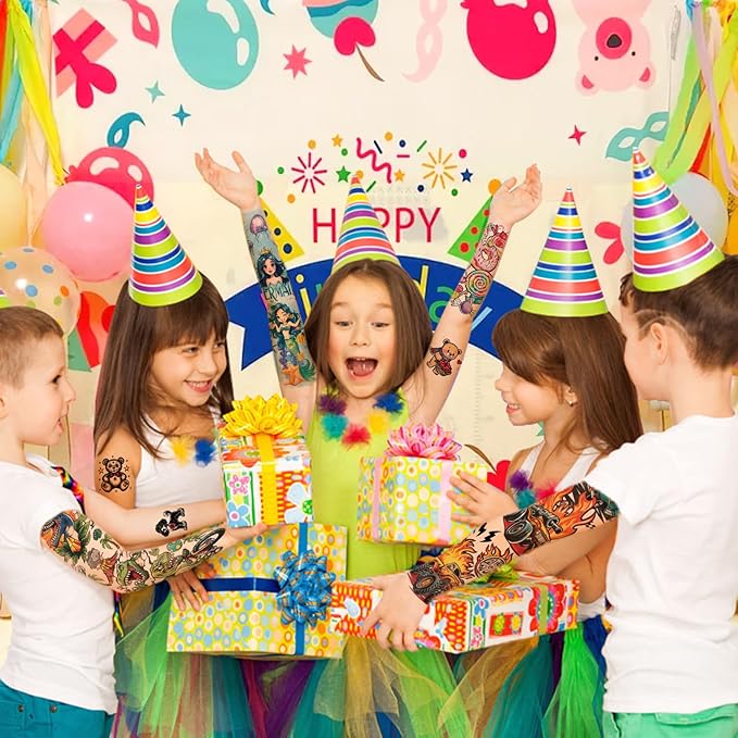 - 【Best Gift for Kids】Uniquely designed with bright colors, kids sleeve tattoos temporary are vibrant,lovely and waterproof. These kids tattoo sleeve is a wonderful gift for kids. Temp Tattoos Suitable For Halloween Makeup Kit, Prank, Zombie Chucky Makeup kit, Beach, Gym, Party Favor Supplies, Club, Bottle, Bachelorette Parties, Festival Tattoos, BBQ Picnic, Camping, Biker, Clip Art, Party Decoration, Basket Goodie Bag Fillers, Stocking Stuffer, Halloween Costume, Cosplay, Cutout, Rave Accessories, Phone Case, Car Decals, Masquerade, Carnival, Tumblers Cups, Day of Dead, Easter Day.