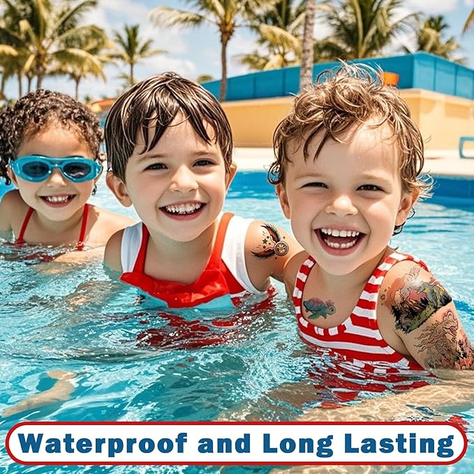 - 【Safe for Kids Fake Tattoos】These kids sleeve tattoos temporary are waterproof, non-toxic and non-allergic. Safe for all skin and all ages over 3 years old. It can last about 3-7 days. The kids can wear this temp tattos to have fun without worries.