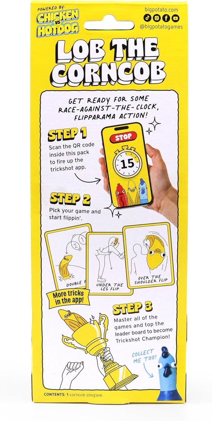 - IT’S FLIPPING GOOD FUN: It’s the bottle flip challenge meets a daredevil vegetable. Lob the cob with friends to see who can land those trickshots first.