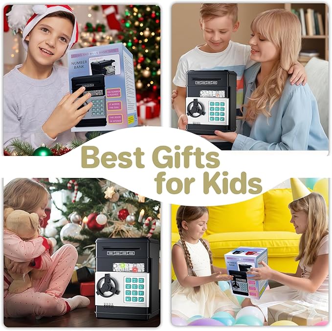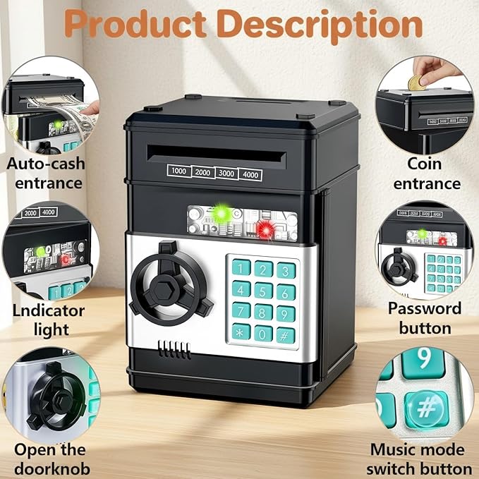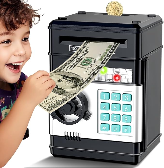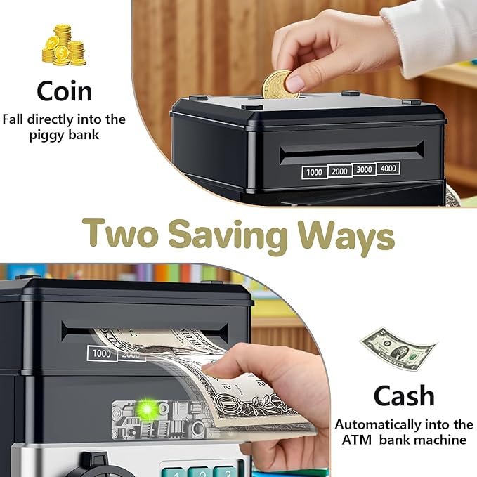 - đ€ [Smart Saving Adventure] Welcome to the world of fun finance! Our extra-large electronic piggy bank isnât just a coin collectorâitâs your childâs first step toward money mastery. Designed for modern young savers, this sleek black piggy bank combines security, education, and excitement all in one!