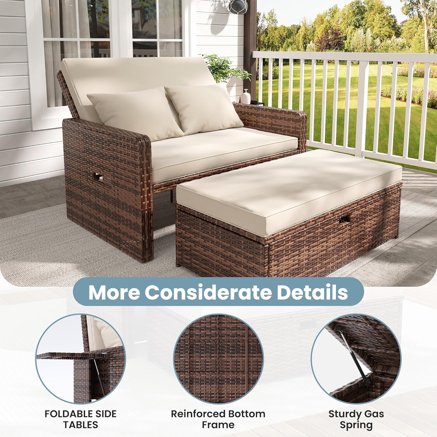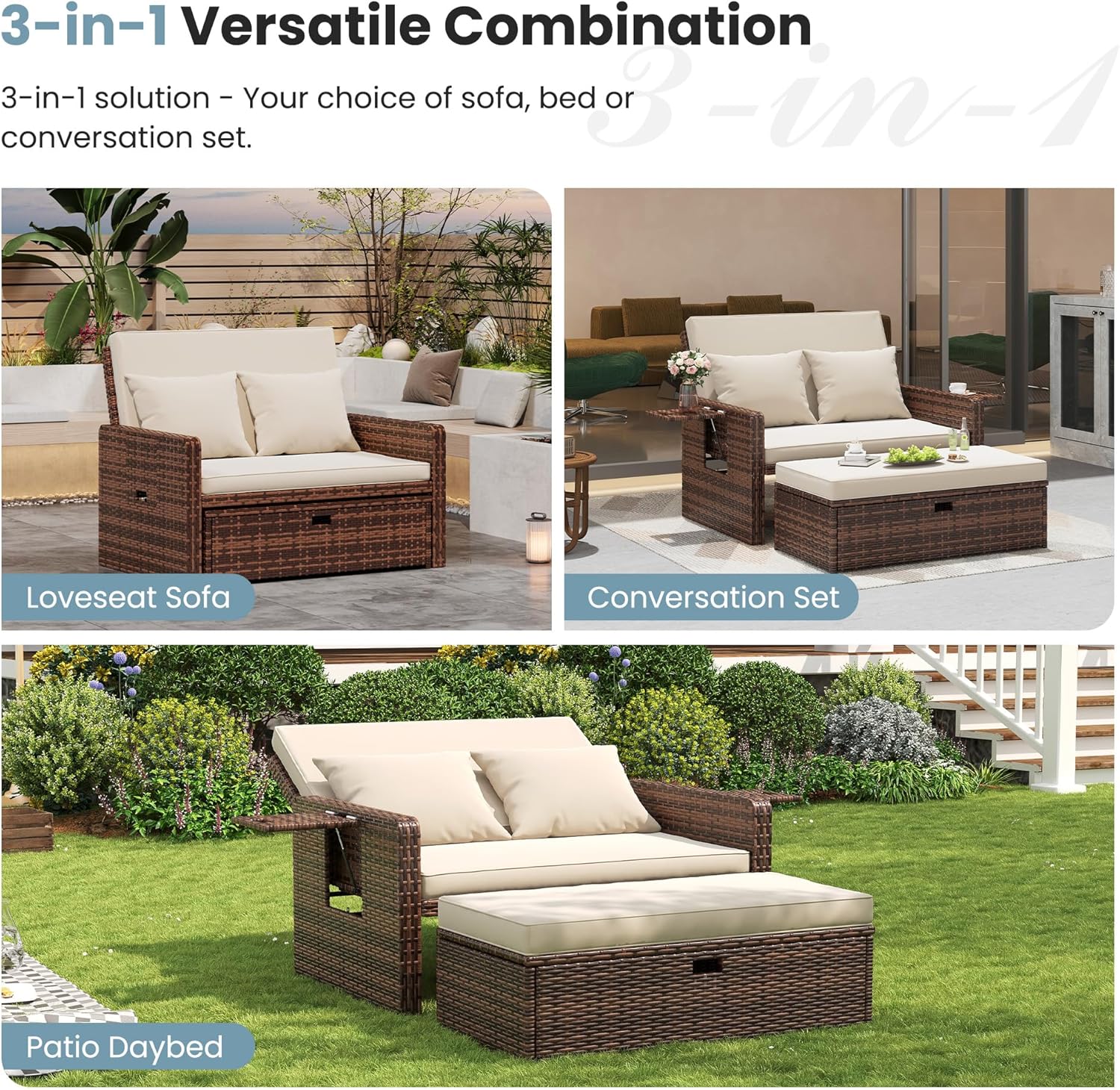 - 【3-in-1 Multifunctional Design】This outdoor furniture set combines a loveseat and ottoman, transforming easily into a double chaise lounge, daybed, or sofa. The 4-level adjustable backrest lets you sit, recline, or lie flat,while the ottoman conveniently slides under the loveseat for space-saving storage.