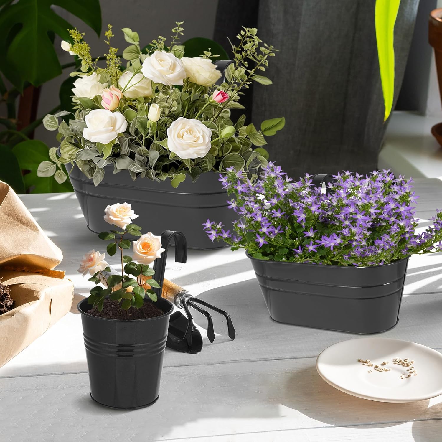 3 Different Size Metal Iron Hanging Flower Pots 10 Pcs for Outdoor Plants Metal Hanging Bucket Pots Iron Railing Fence Planter with Drainage Holes and Hooks for Porch Railing Balcony Fence (Black)