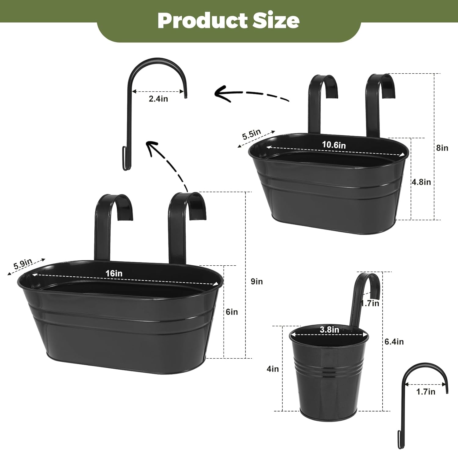 - 【SIZE DETAILS】Each set of Railing Flower Baskets contains 6 large flower baskets with dimensions of 16" x 5.9" x 6", 3 medium-sized flower baskets with dimensions of 10.6 " x 5.5" x 4.8", and 4 small flower baskets with dimensions of 3.8" x 3.8" x 4.0"(L x W x H).The Flower Basket Hook is included in the package and is very easy to install.