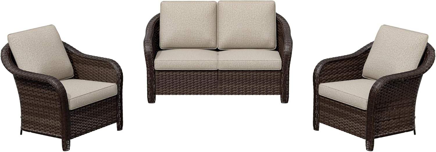 - Packing Included: The 3 pcs set includes 2 x armchairs, 1 x 2-seat sofa. The tools and instructions needed for installation will also be in the box.The 4 pieces patio dining set will come in 2 boxes. They may come in different days