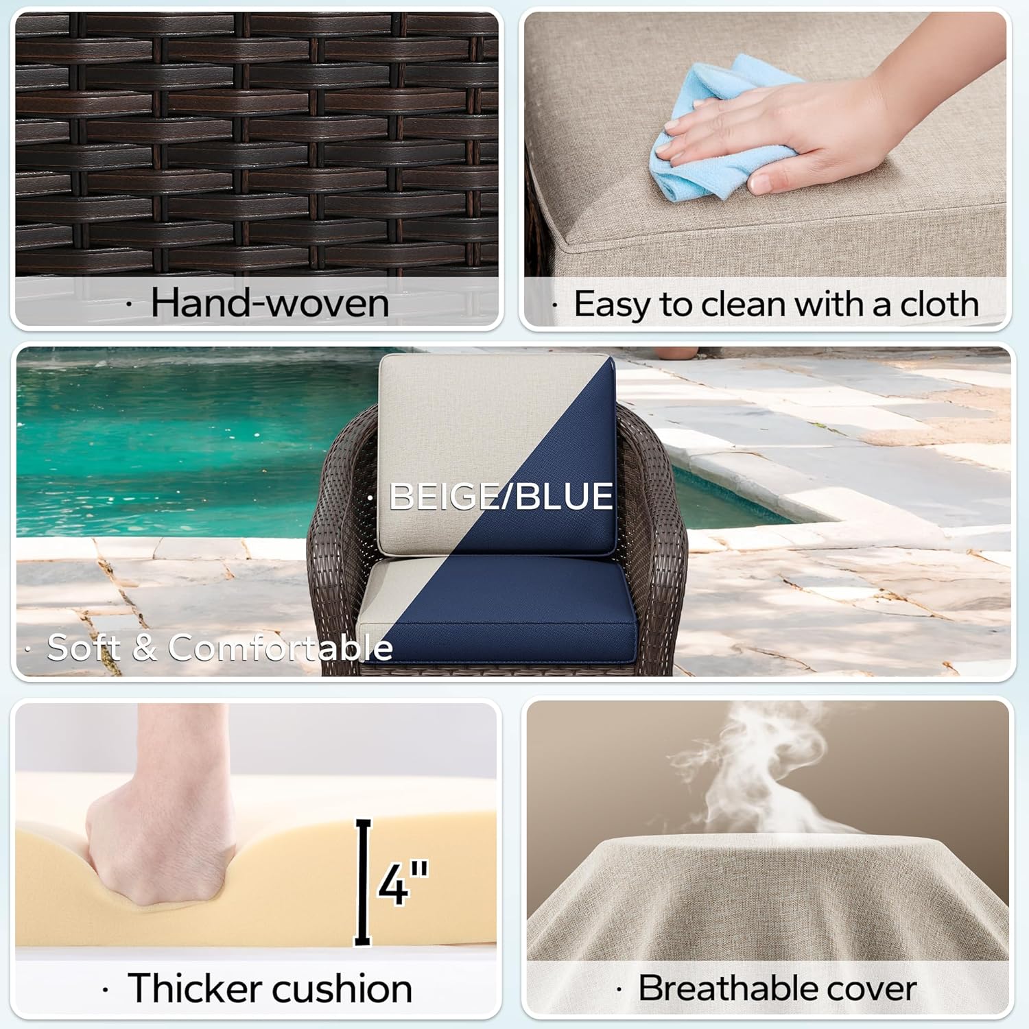- Sturdy and Durable: The outdoor furniture set is made of steel frame and PE wicker, ensuring that it will be more sturdy. Fade-resistant fabrics of cushions is stain & fade resistance, tear & wear resistance